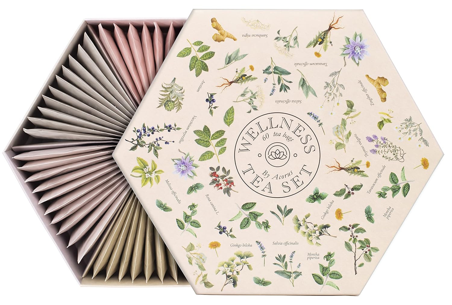 Apple, white hibiscus, natural flavours, roasted chicory root, rosehip, hibiscus, acidity regulator citric acid, orange peels, lemon peels, pear, pineapple, stevia leaves.