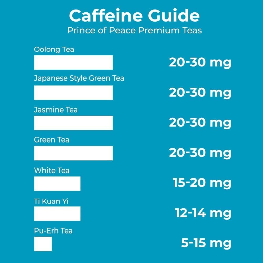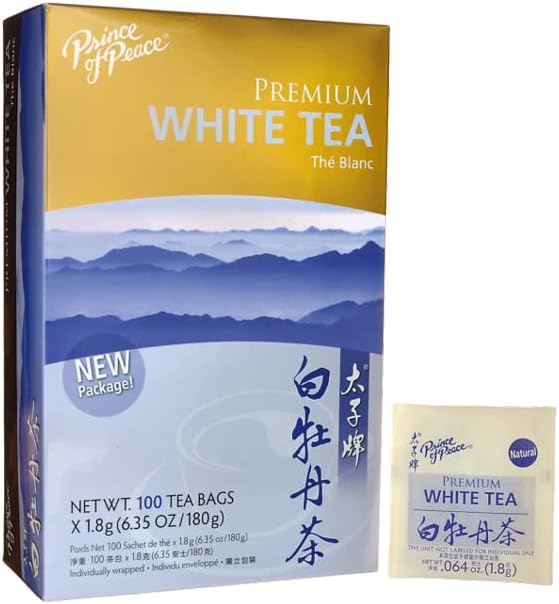 White Tea from Prince of Peace is made from naturally grown leaves and buds that are picked at a young age. Using a Zhenge-style of processing, Prince of Peace White Tea has a rich aroma and full-bodied taste. A typical cup of premium grade white tea has about 10–20 mg of caffeine while a cup of coffee ranges from 100–180 mg.