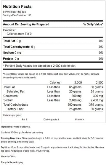 White Tea from Prince of Peace has zero calories, sugar, fat, or sodium. This tea variety is unlikely to dehydrate the body because it contains such a small amount of caffeine in comparison to coffee.