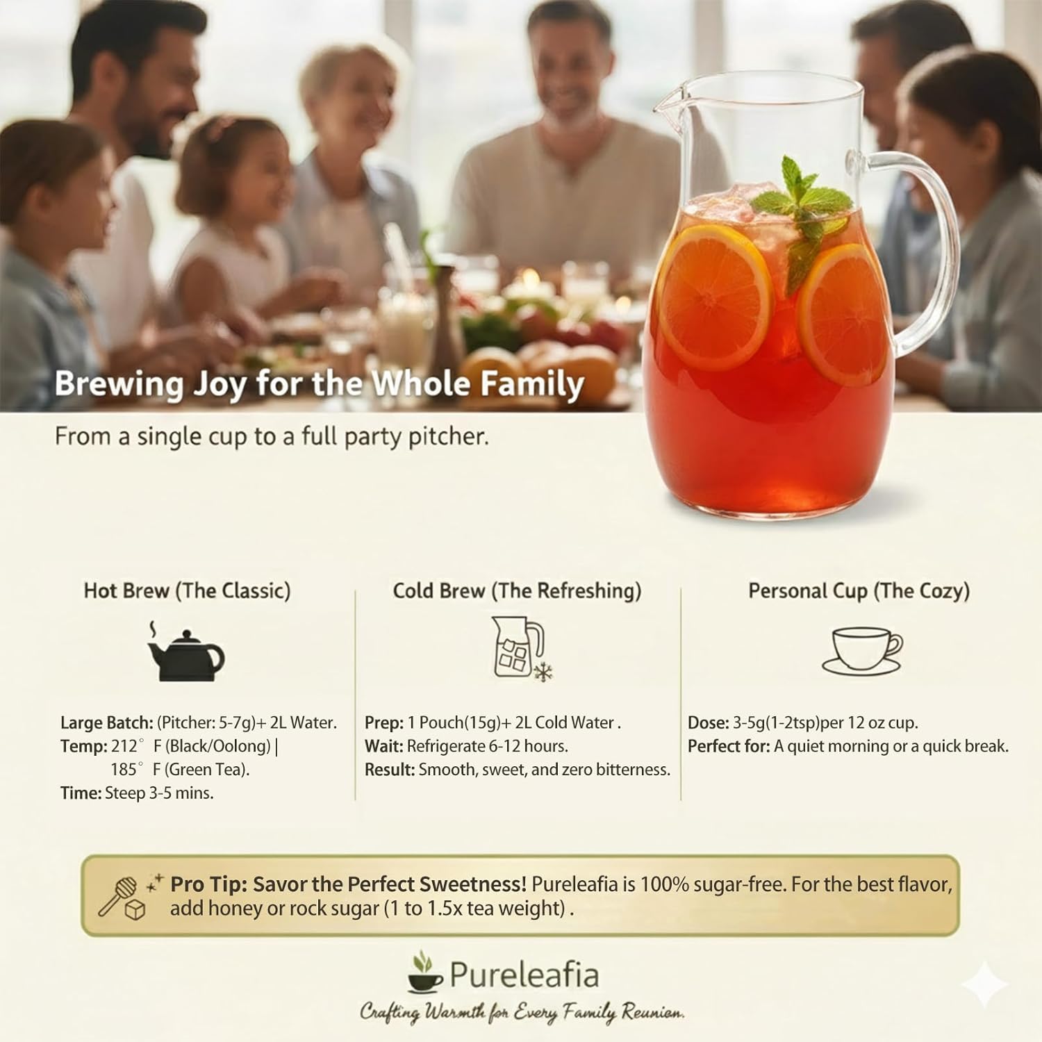 - The Perfect Tea Time Companion: Whether paired with exquisite pastries during a leisurely afternoon or enjoyed during cozy indoor family moments, Pureleafia’s natural flavors add a touch of sophistication to your daily life.