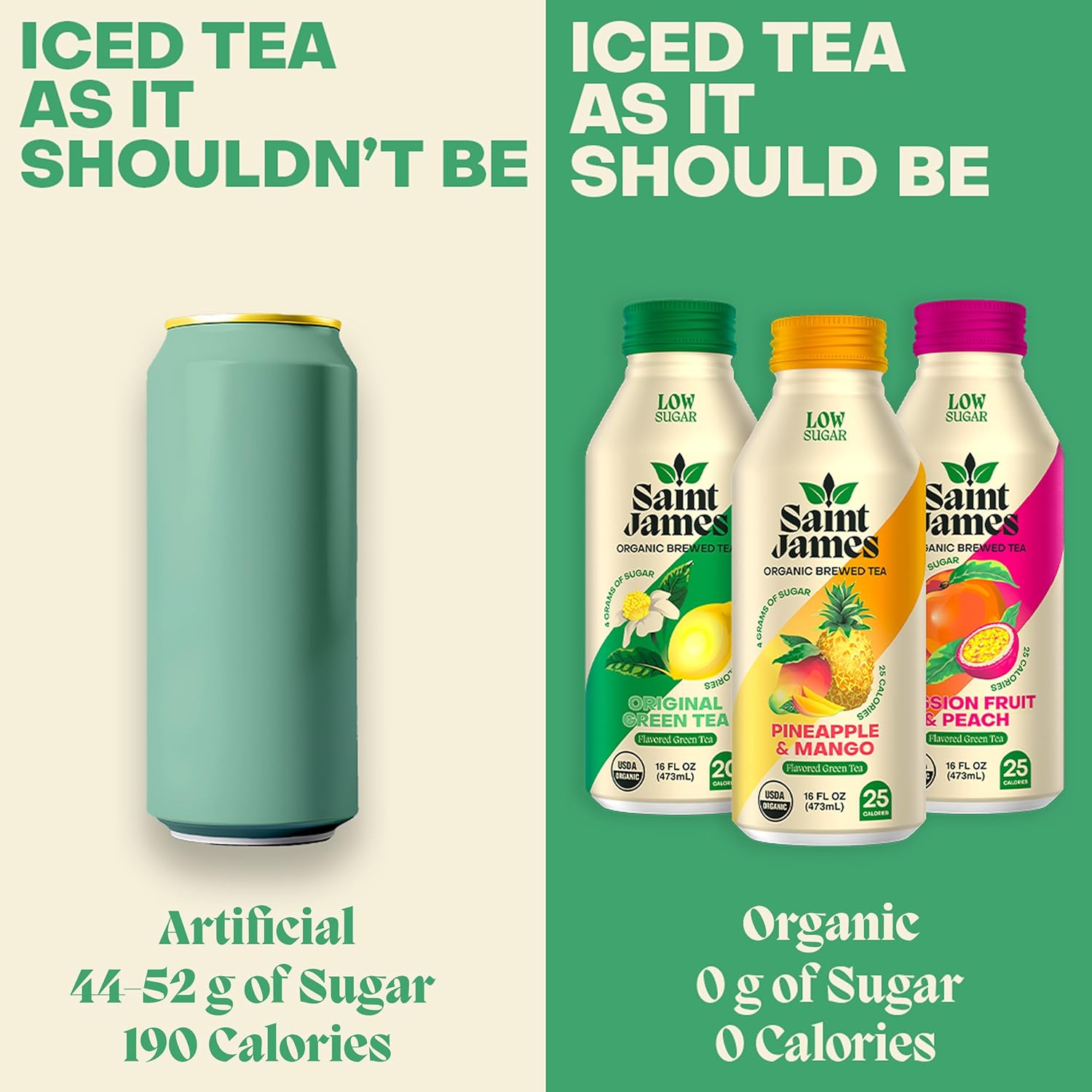 Saint James Iced Tea – Organic Green Tea – Non GMO, Gluten Free, Low Calorie & Low Sugar – Variety Green Tea Flavors, 12 Pack (16.9 fl oz each) | Non GMO, Gluten Free, Low Calorie, Low Sugar