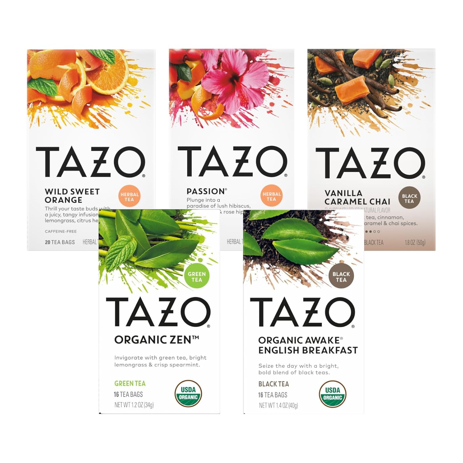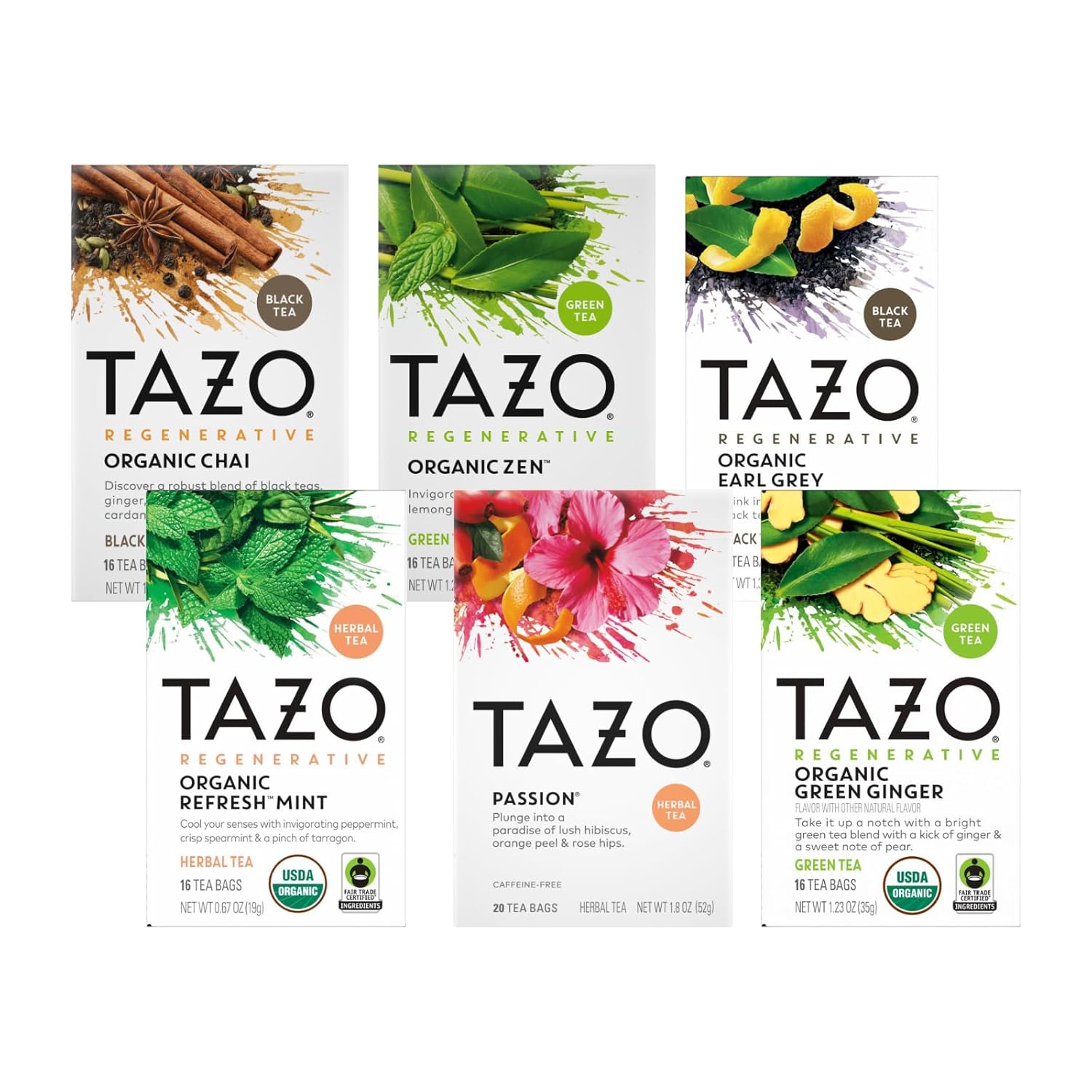 | TAZO Regenerative Awake English Breakfast – a bold blend of organic, fair trade black teas for the no-nonsense tea-drinker. | TAZO Regenerative ZEN combines the freshest organic, fair trade green tea with crisp spearmint, lemon verbena, and zesty lemongrass for an extra-invigorating sip. | TAZO Regenerative Chai combines the boldest organic, fair trade black teas with the richest chai spices for an invigorating sip. |