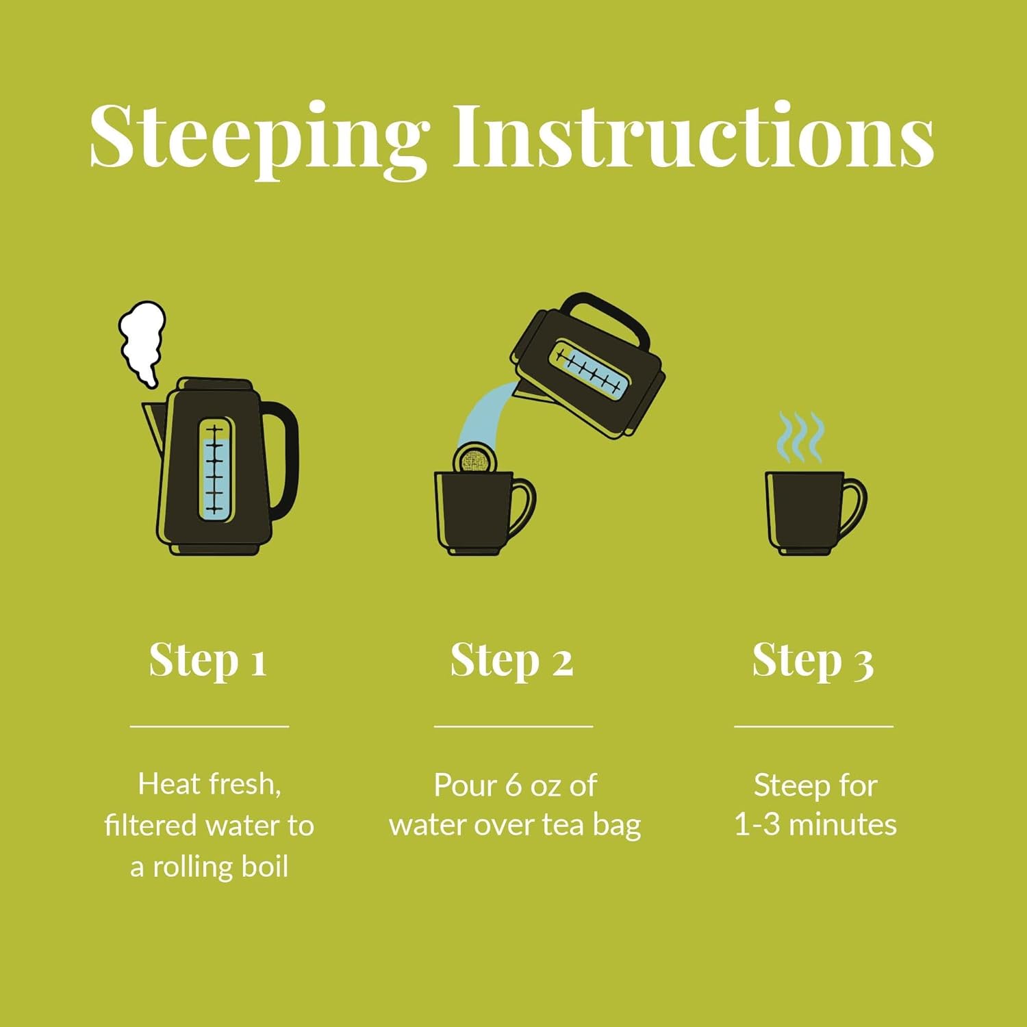 Place one tea bag in your cup, pour in 6 oz of water and infuse for one to three minutes.