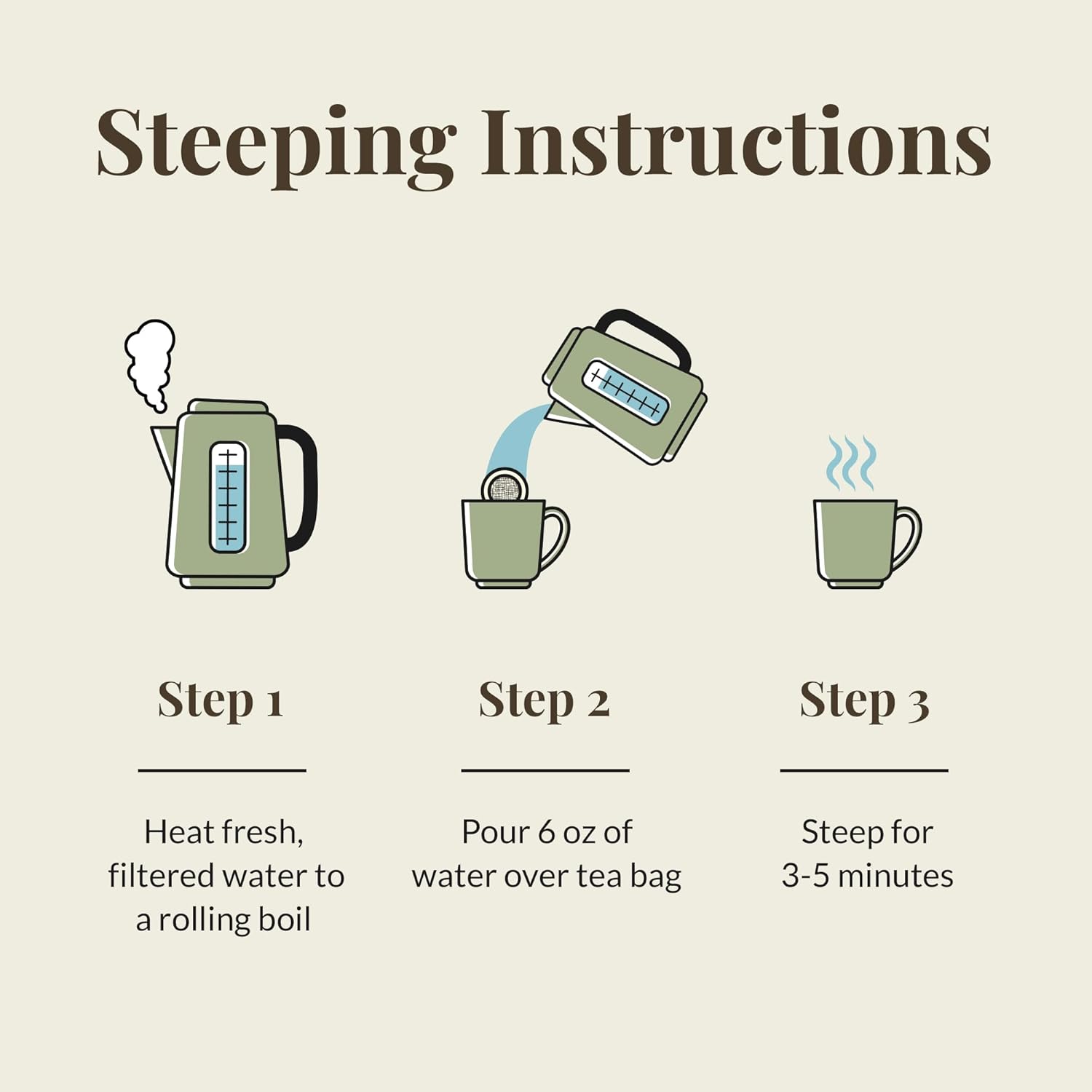 Steeping Guidelines Infuse one tea bag in 6 oz of just short of boiling water for 3-5 min. |