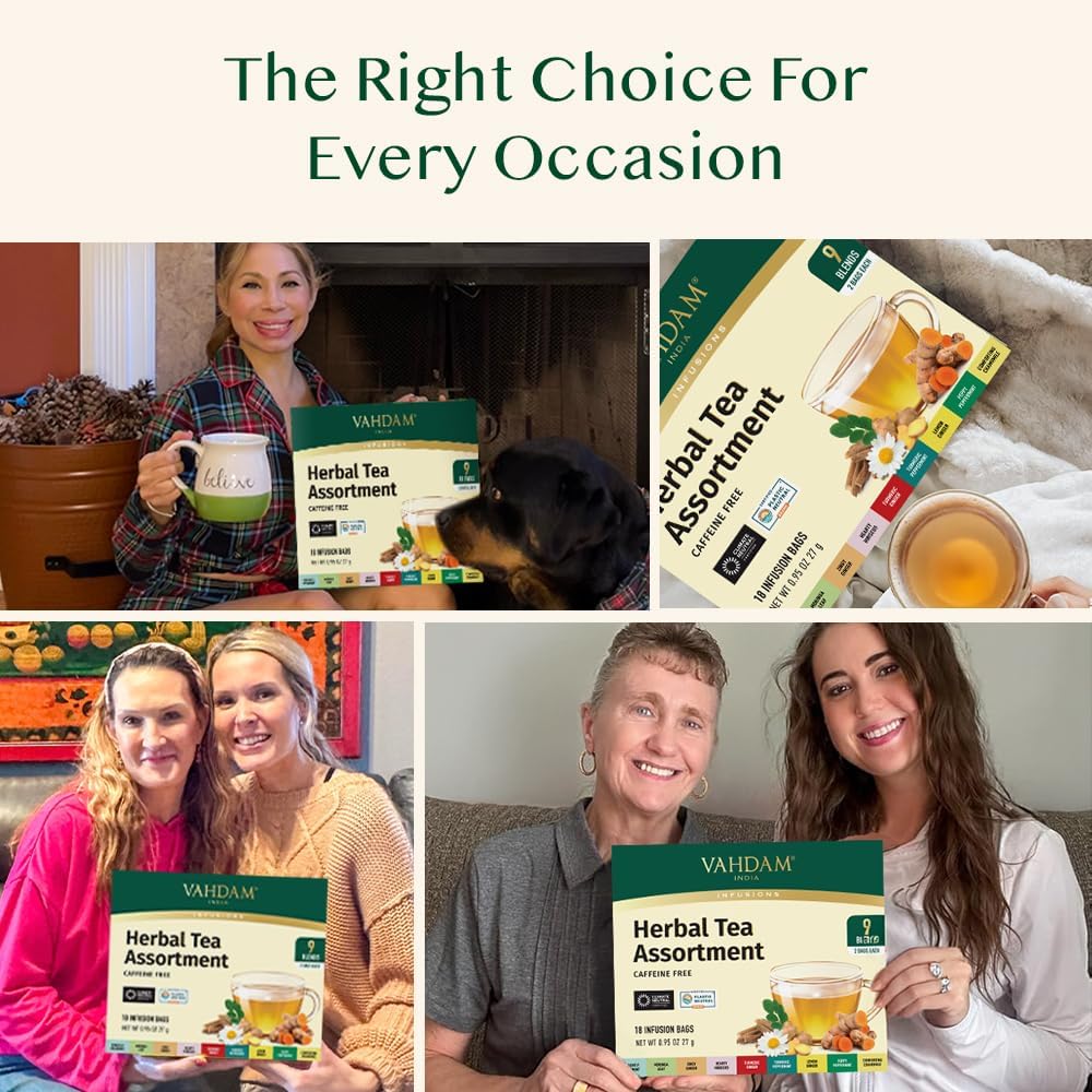 VAHDAM, Assorted Herbal Tea Sampler (18 Tea Bags, 9 Flavors) Caffeine-Free, Non-GMO | Double Infusion, Individually Enveloped Tea Bags | Herbal Tea Assortment | Valentines Day Gifts for Him & Her