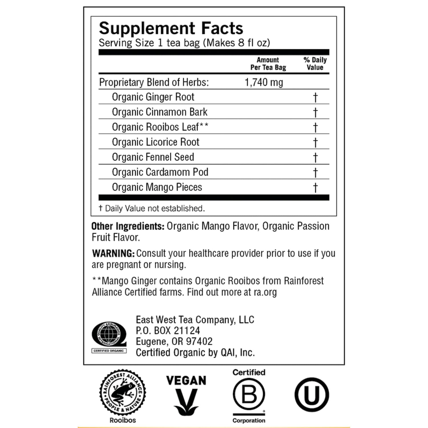 - CONTENTS: Caffeine-free, Vegan, Kosher, Rainforest Alliance Certified, Gluten-free, No Artificial Flavors or Sweeteners, and individually packaged with compostable bags.